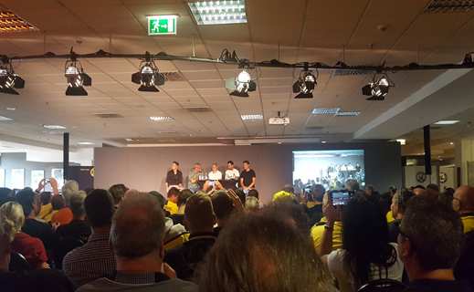 Zum Start der neuen Saison 2019/20 stand ein echtes Highlight für jeden BVB-Fan parat! Das erste Pflichtspiel im DFB-Pokal führte unsere Jungs an einem Freitagabend zum Drittligisten KFC Uerdingen mit dem dort spielenden Ex-Dortmunder Kevin Großkreutz. Bei uns im Fanclub machten sich einige Dutzend per Zug oder Auto auf in die Düsseldorfer Arena, wo der KFC aktuell seine Heimspiele austrägt. Nach dem ein oder anderen Bier bei der Anreise, machten wir noch einen kleinen Zwischenstopp an einem kleinen Kiosk direkt am Rhein. Von dort aus ging es mit großer Freude ins Stadion. Der Gästeblock war diesmal mit 15.000 Schwarz-Gelben ungewohnt groß, da uns auch die Gegentribüne zur Verfügung stand.
